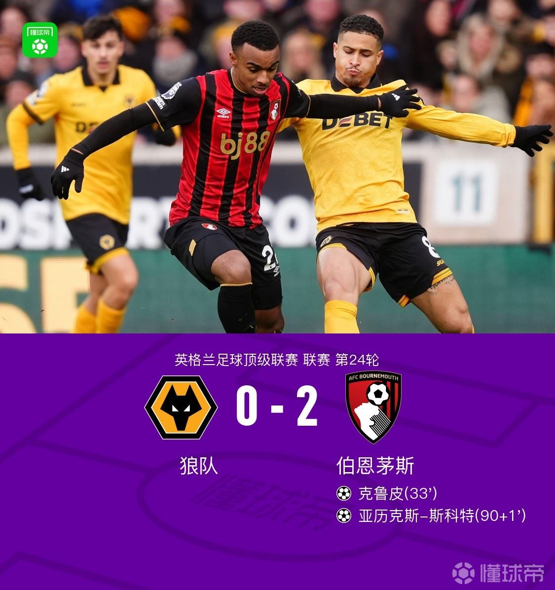 北京时间1月31日,英格兰足球顶级联赛第24轮,狼队主场对阵伯恩茅斯。比赛中,克鲁皮轰世界波,亚历克斯-斯科特锁定胜局。最终,狼队0-2不敌伯恩茅斯。