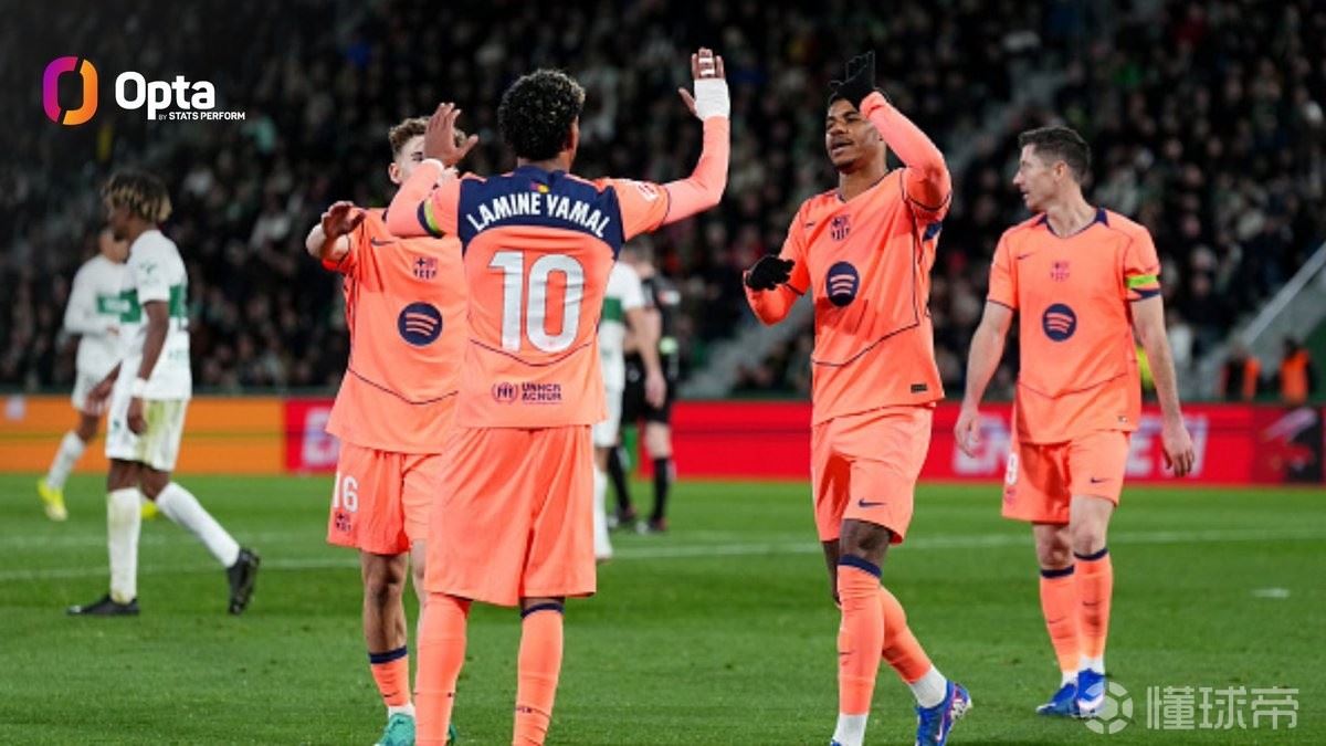 西甲第22轮,巴塞罗那客场对阵埃尔切,下半场拉什福德打入个人本赛季第10球,至此,巴萨本赛季已有6名球员进球上双,五大联赛没有其他球队超过3人进球上双。