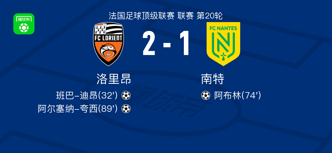 北京时间2月1日法国足球顶级联赛 联赛 第20轮,洛里昂主场对阵南特。洛里昂班巴-迪昂破门,阿尔塞纳-夸西破门。南特阿布林破门。最终比分洛里昂 2-1 南特。