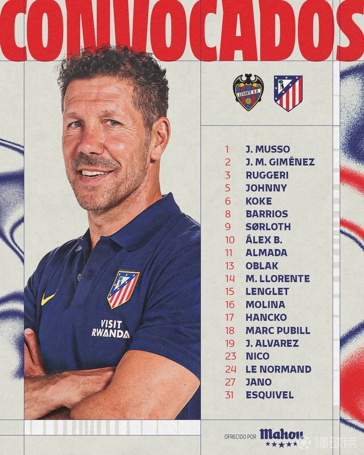 北京时间1月31日,马德里竞技宣布了本周末西甲第22轮他们做客挑战莱万特的大名单,在格列兹曼和朱利亚诺-西蒙尼受伤的情况下,他们一线队的非门将球员仅剩16人。