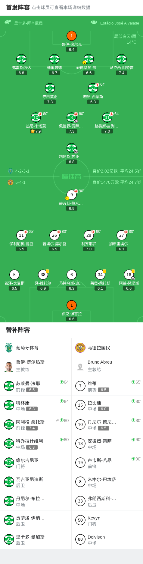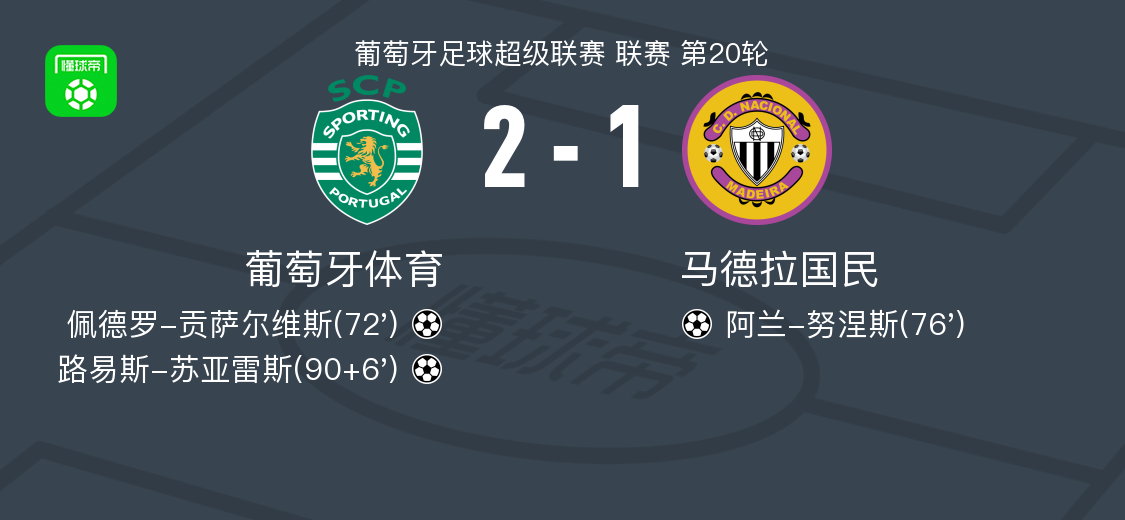 北京时间2月2日葡萄牙足球超级联赛 联赛 第20轮,葡萄牙体育主场对阵马德拉国民。葡萄牙体育佩德罗-贡萨尔维斯破门,路易斯-苏亚雷斯破门。马德拉国民阿兰-努涅斯破门。最终比分葡萄牙体育 2-1 马德拉国民。
