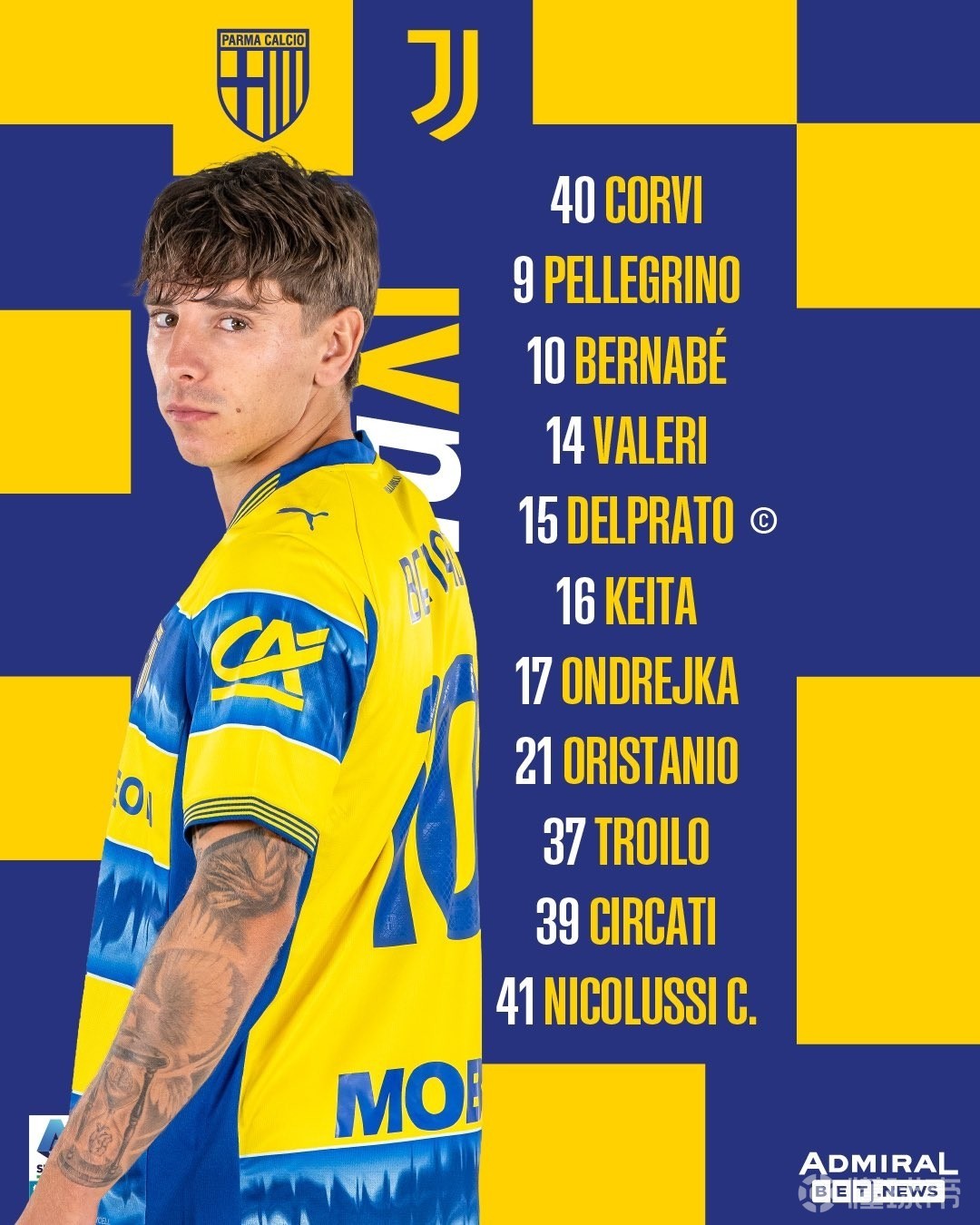 帕尔马首发:40-科尔维、37-特罗伊洛、39-奇尔卡蒂、15-德尔普拉托、14-瓦莱里、16-曼德拉-凯塔、21-奥里斯塔尼奥、10-贝尔纳韦、41-卡维利亚、9-马特奥-佩莱格里诺、17-翁德赖伊卡