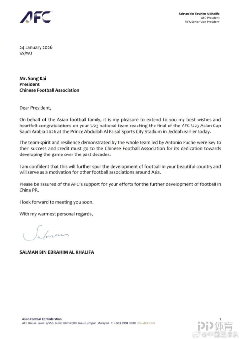 据中国足球队官方消息,1月24日,亚足联主席萨尔曼致函中国足球协会,热烈祝贺中国U-23国家男子足球队在前不久结束的U23亚洲杯上,通过不懈努力,成功打入决赛。中国足协主席宋凯近日回函,对萨尔曼的祝贺和鼓励给予感谢。
