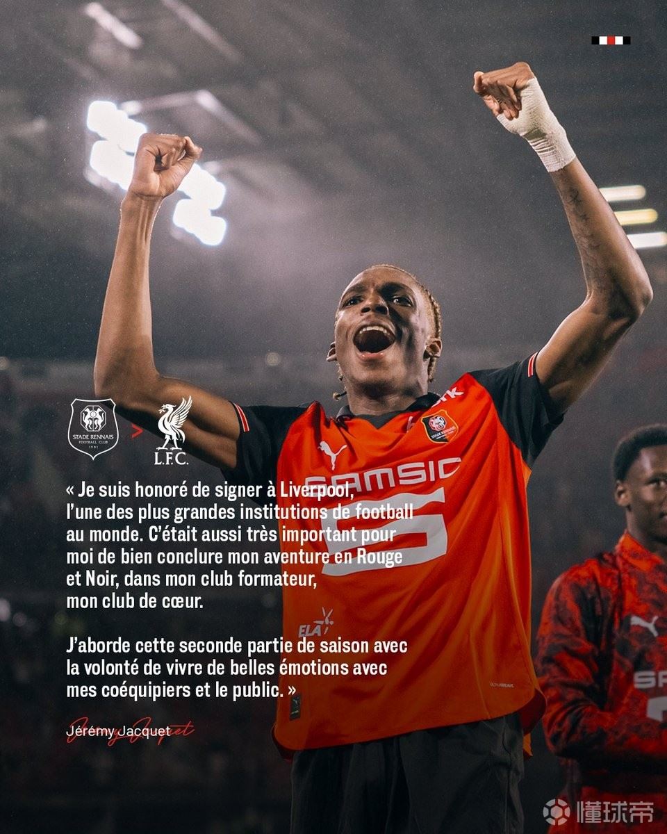北京时间2月3日,利物浦官宣签下雷恩后卫雅凯。雷恩官方社媒随后发布了动态,雅凯本人发表了转会感言。