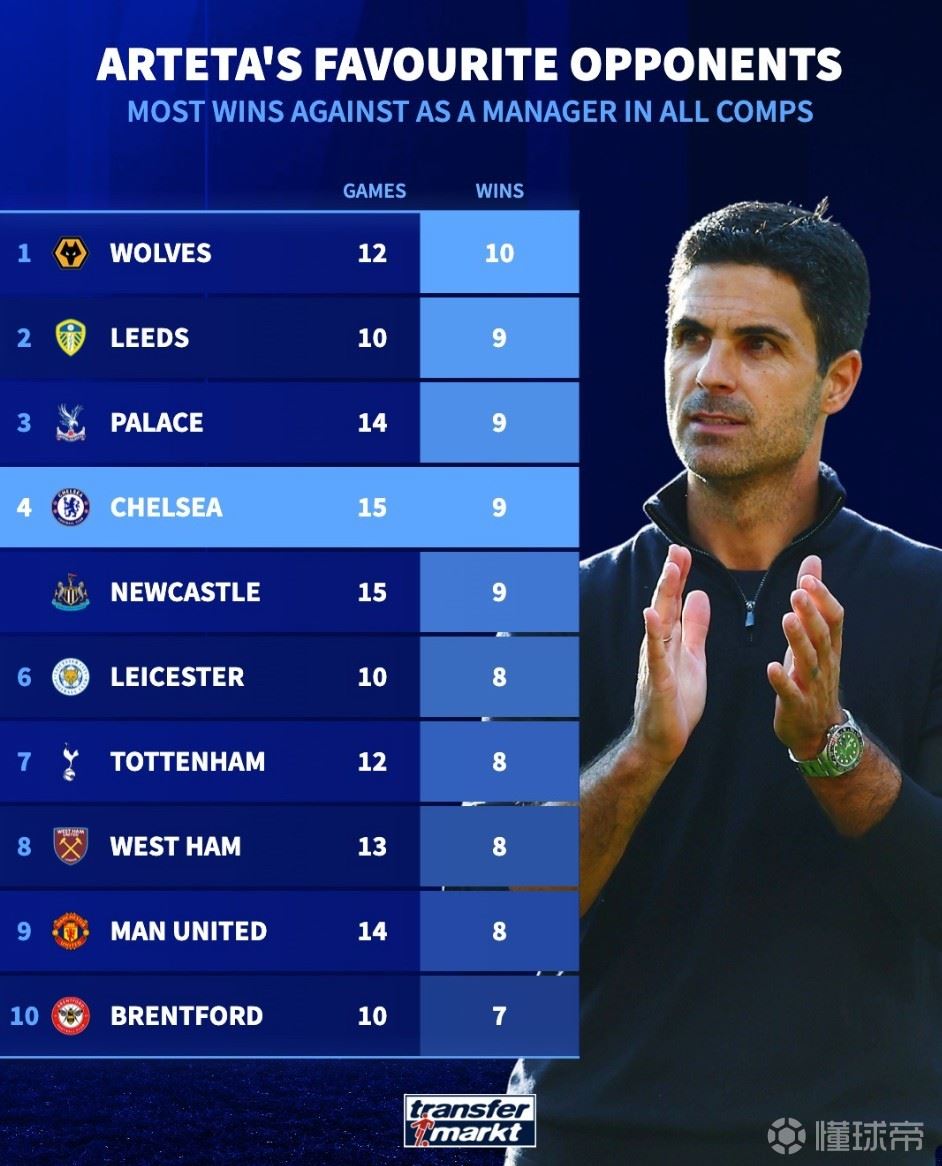 北京时间2月4日,在阿森纳即将坐镇主场迎来与切尔西的联赛杯半决赛次回合比赛的情况下,德转统计出了阿尔特塔教练生涯各项赛事赢球场次最多的对手,此前他率队15次对阵蓝军取胜9场位列第4。