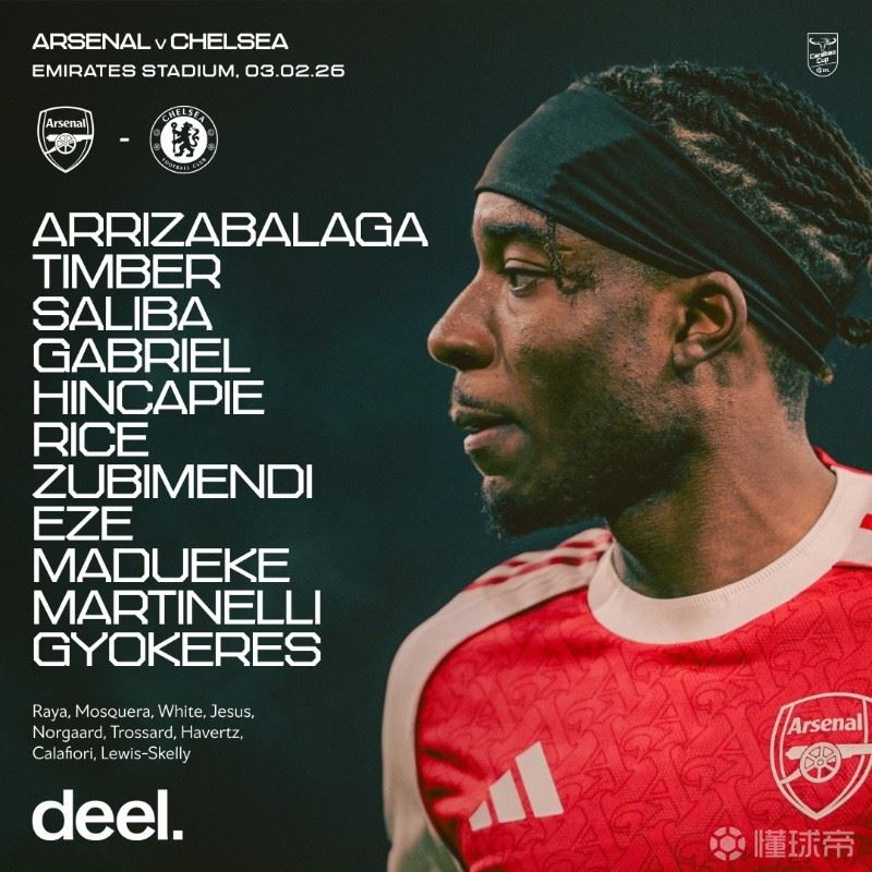 阿森纳首发:13-凯帕、12-廷贝尔、2-萨利巴、6-加布里埃尔、5-因卡皮耶、36-苏比门迪、41-赖斯、20-马杜埃凯、10-埃泽、11-马丁内利、14-哲凯赖什