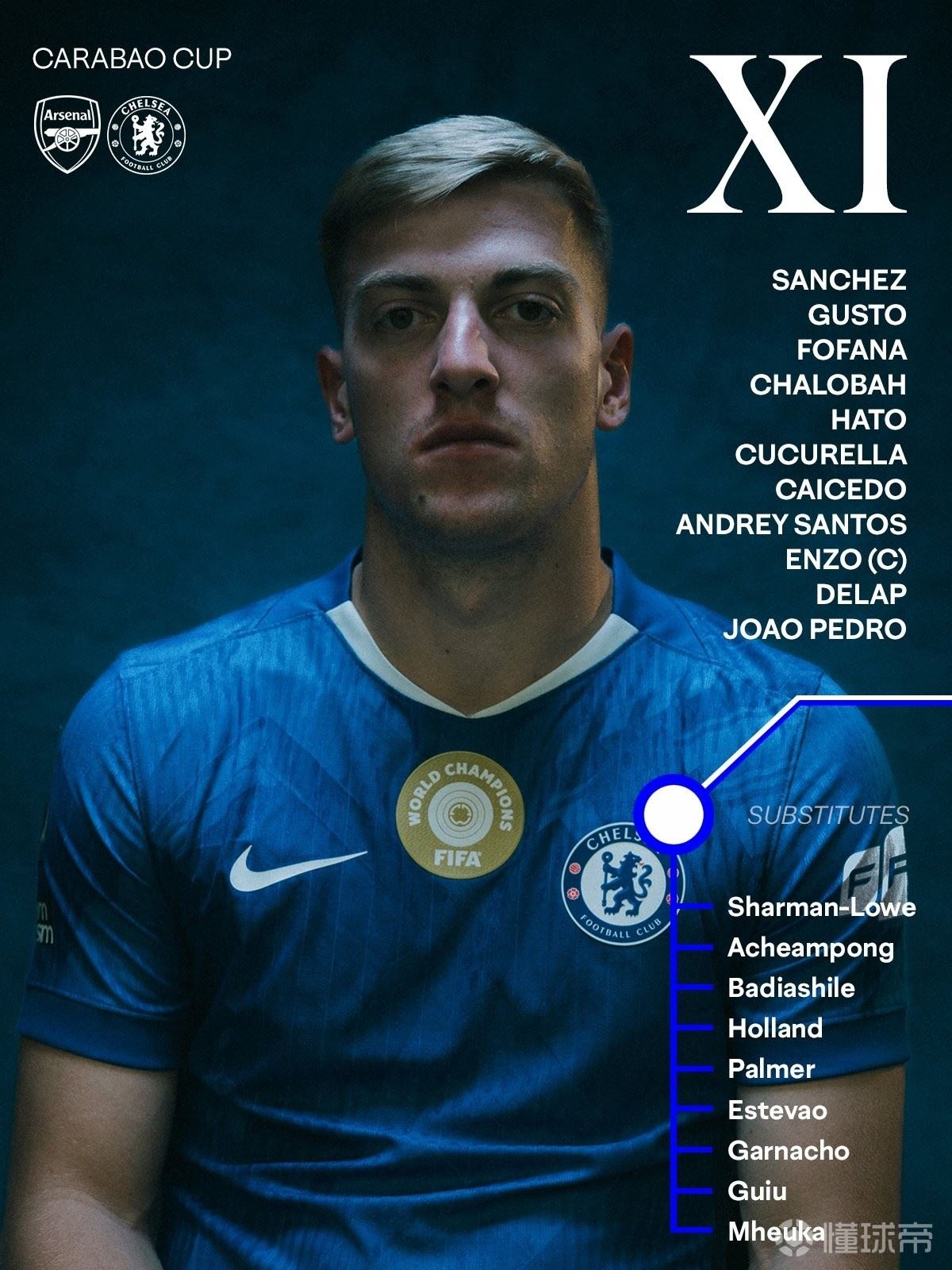 切尔西首发:1-桑切斯、21-哈托、23-查洛巴、29-福法纳、3-库库雷利亚、8-恩佐、17-桑托斯、25-凯塞多、27-古斯托、20-佩德罗、9-德拉普