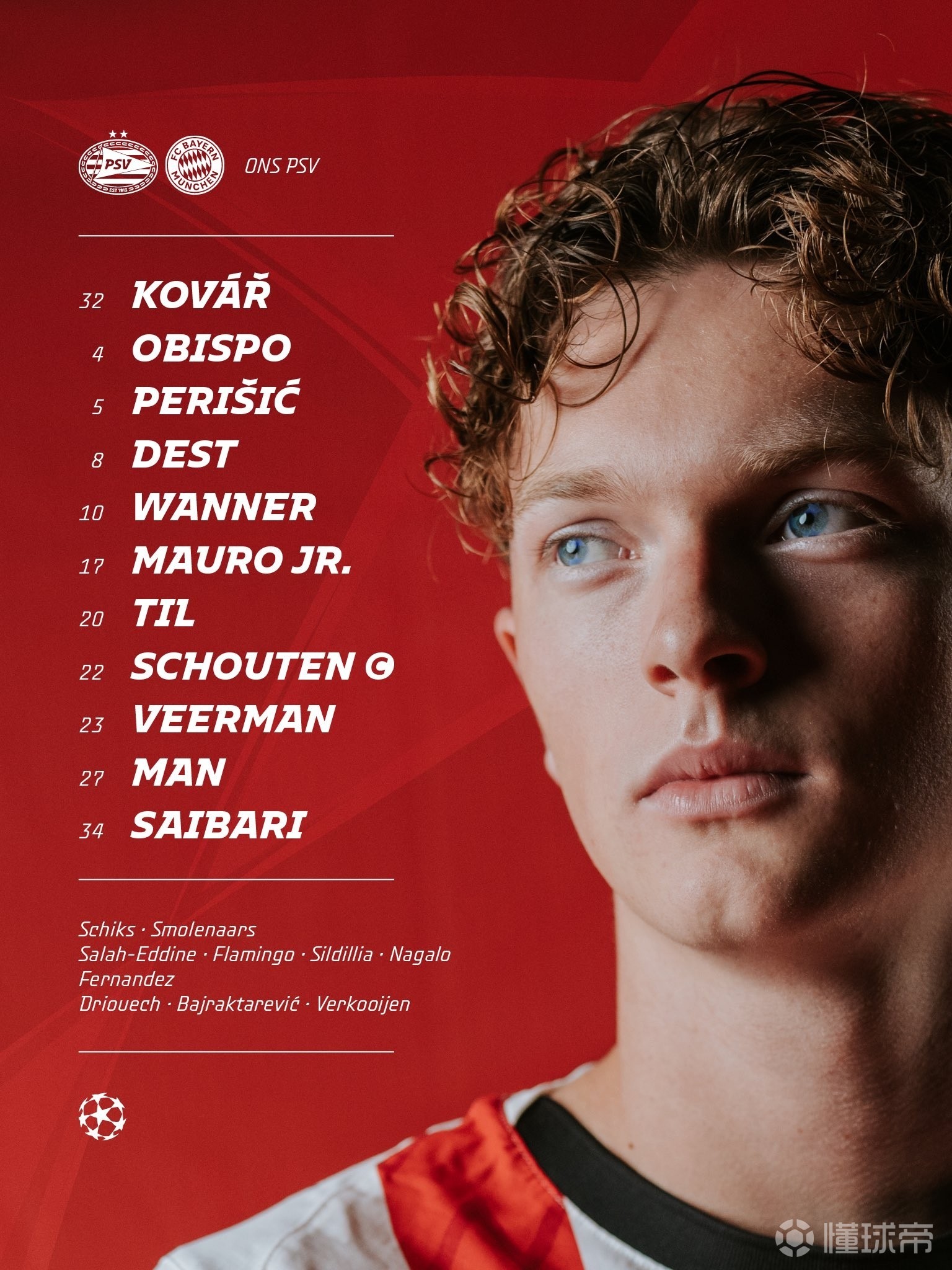 埃因霍温首发:32-科瓦日、8-德斯特、22-斯豪滕、4-奥比斯波、17-毛罗-儒尼奥尔、20-蒂尔、23-费尔曼、27-丹尼斯-曼、10-万纳、5-佩里西奇、34-萨伊瓦里