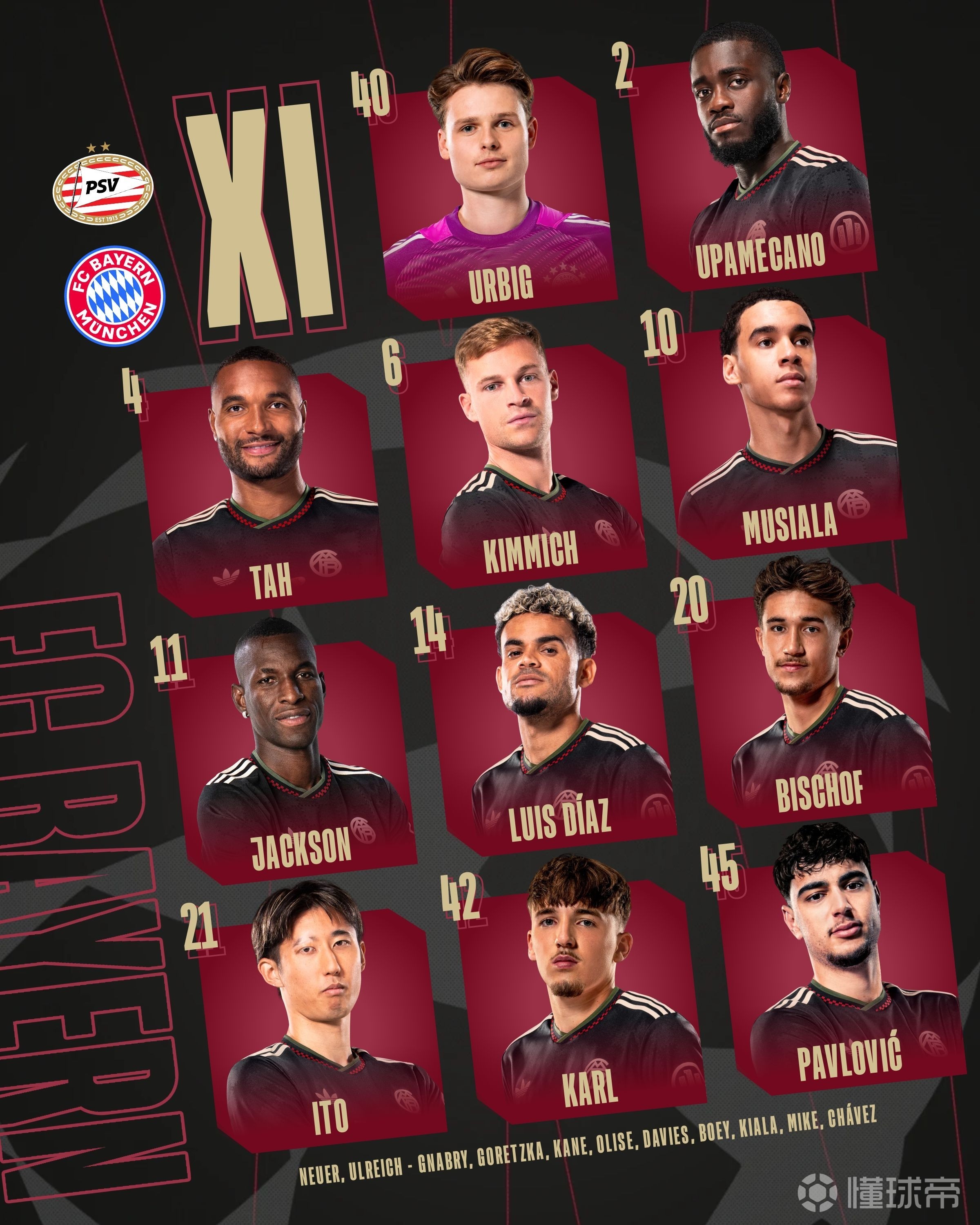 替补:1-诺伊尔、26-乌尔赖希、7-格纳布里、8-格雷茨卡、9-凯恩、17-奥利塞、19-阿方索-戴维斯、23-博埃、30-基亚拉、36-迈克、38-查韦斯