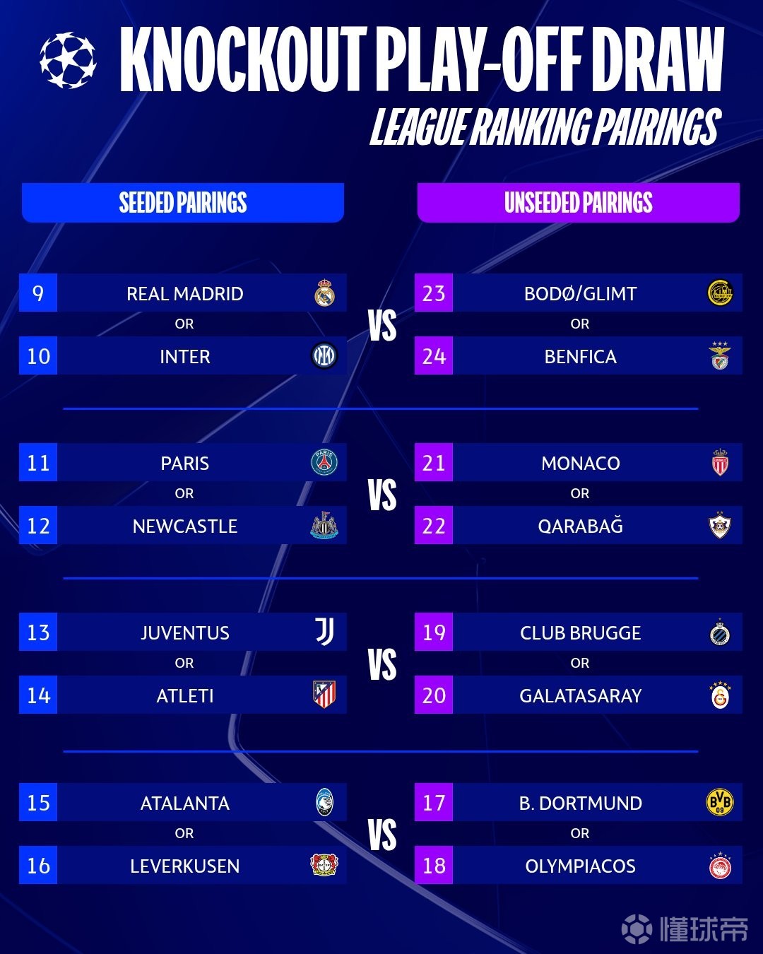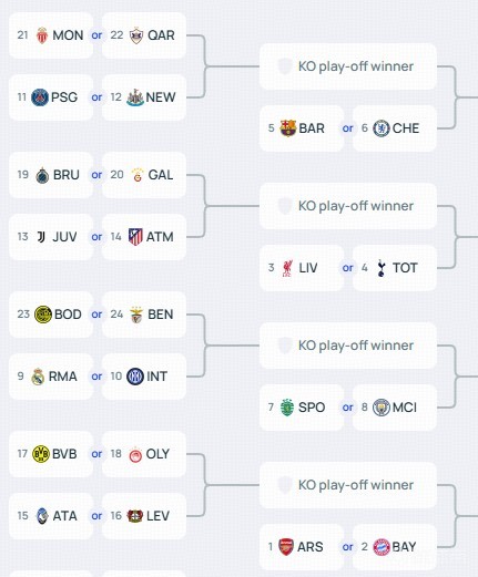 在联赛阶段结束后,1/8决赛的四组分区也已经确定。不过今晚不会确定1/8决赛的具体对阵情况,但直通1/8的球队已经得知了自己的4个潜在对手。