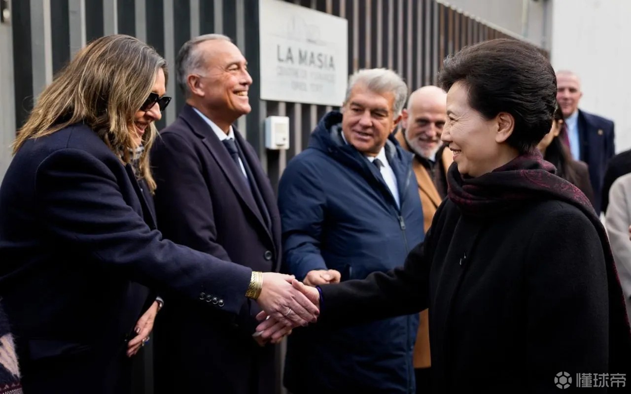 巴塞罗那足球俱乐部主席拉波尔塔与西甲联盟主席特巴斯,共同欢迎由中国国务委员谌贻琴率领的中国代表团访问巴萨拉玛西亚青训营。