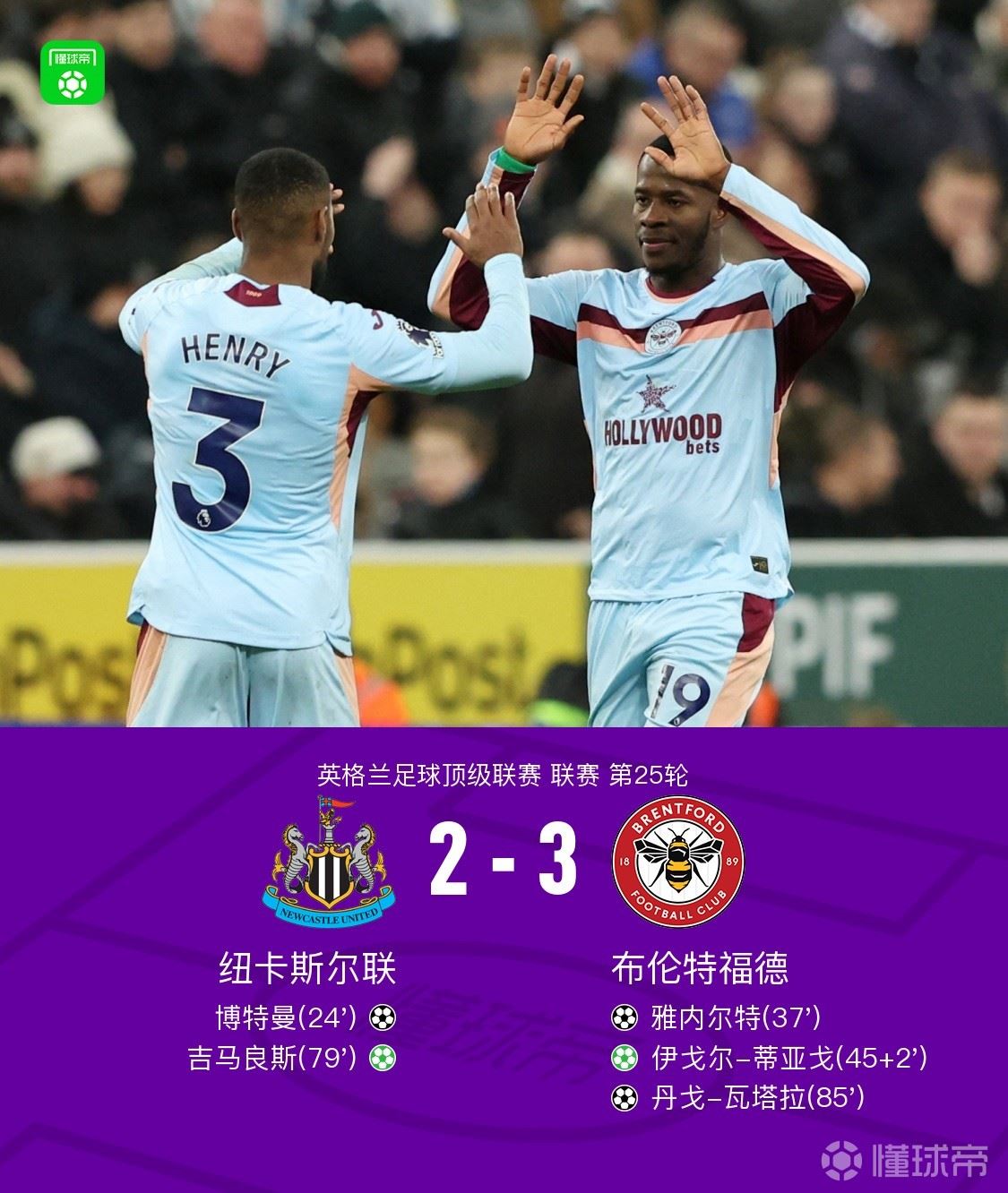 北京时间2月8日英格兰足球顶级联赛 联赛 第25轮,纽卡斯尔联主场对阵布伦特福德。纽卡斯尔联博特曼破门,吉马良斯破门。布伦特福德雅内尔特破门,丹戈-瓦塔拉破门,伊戈尔-蒂亚戈破门。最终比分纽卡斯尔联 2-3 布伦特福德。