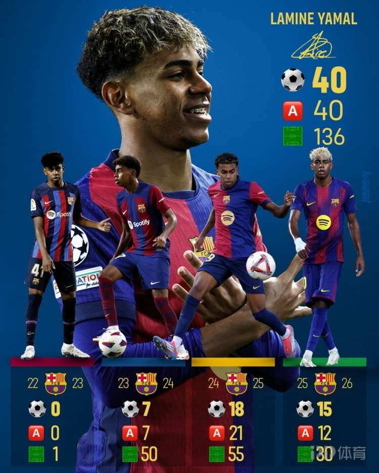 西甲第23轮比赛,亚马尔破门,巴萨主场3-0击败马略卡。据《世界体育报》统计,18岁亚马尔为巴萨出战136场比赛,已贡献40粒进球和40次助攻。
