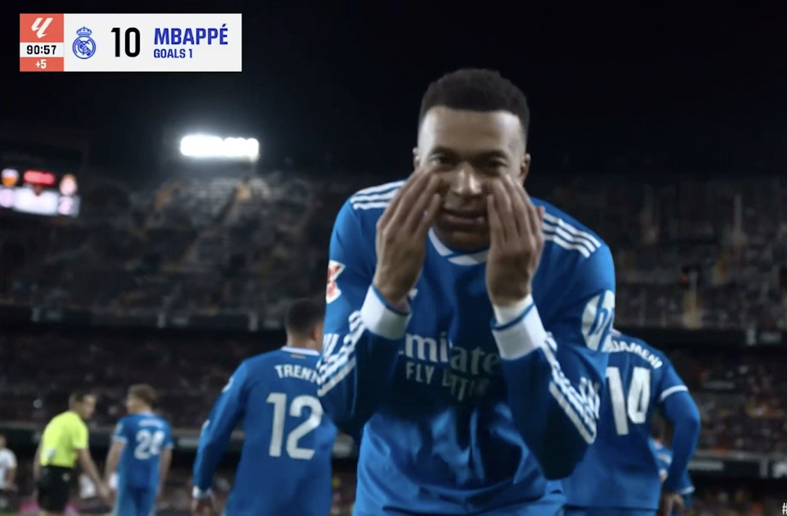 此役客场对阵瓦伦西亚,首发出战的姆巴佩在比赛第91分钟打入一球,帮助皇马取得2-0领先。