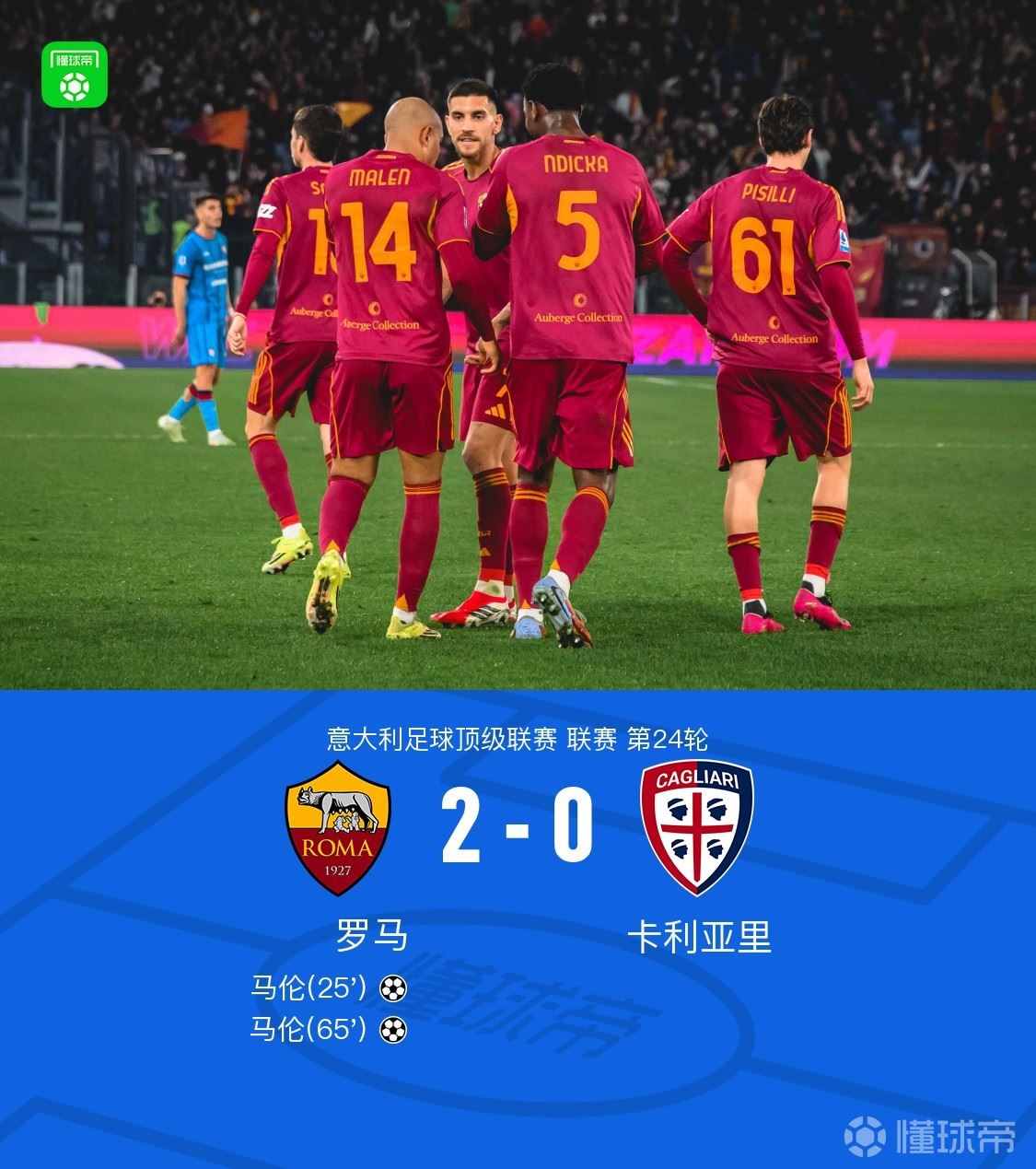 【罗马2-0卡利亚里,马伦梅开二度,切利克、曼奇尼送助攻】