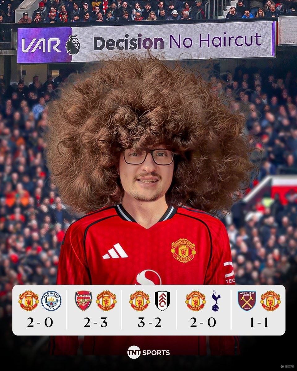 英超第26轮,曼联客场1-1战平西汉姆联,无缘英超五连胜,这也让立志等到曼联五连胜就剪头发的球迷“蓄发哥”愿望再次落空。