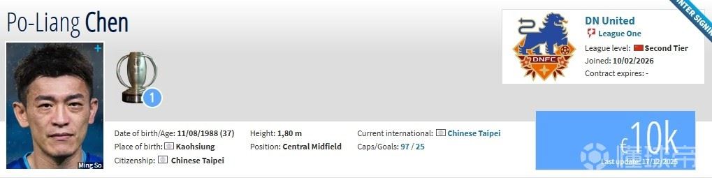 北京时间2月10日,德转更新,37岁中国台北中场陈柏良加盟定南赣联。