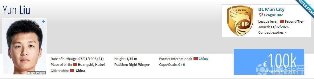 北京时间2月11日,德转更新,刘云自由身加盟大连鲲城,球员上赛季效力于梅州客家。