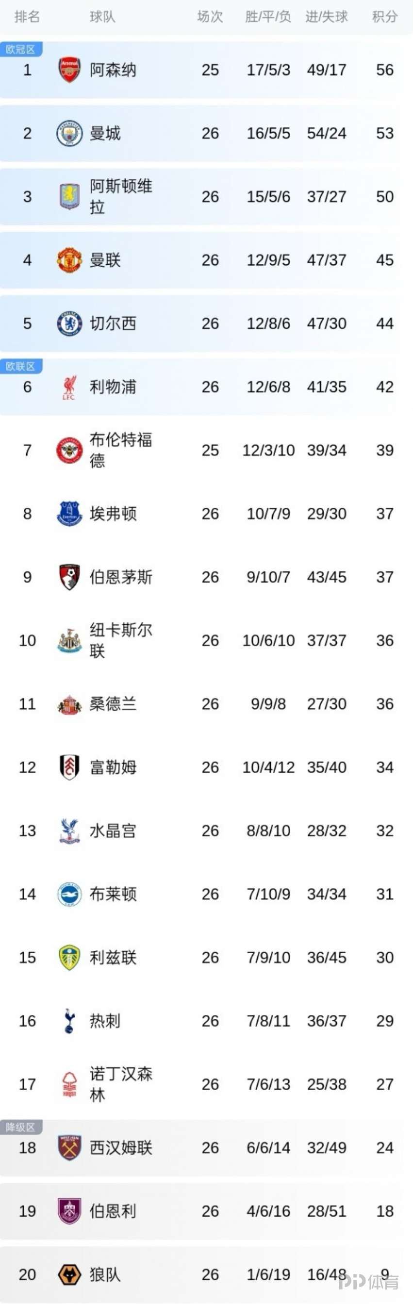 本轮英超结束多场对阵,森林0-0狼队,维拉1-0布莱顿,水晶宫2-3伯恩利,曼城3-0富勒姆,桑德兰0-1利物浦。本轮未赛的还剩下阿森纳,枪手将客场对阵布伦特福德。