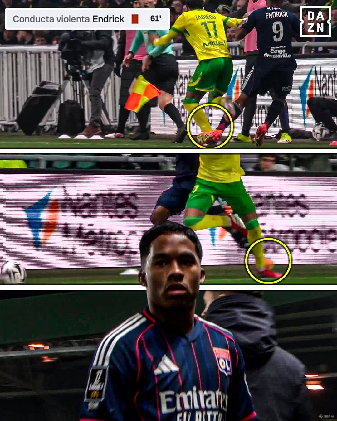 恩德里克拼抢中蹬踏对方球员,被直接红牌罚下