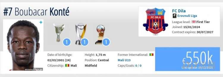 孔特出生于2001年,马里籍,今年25岁,可以胜任前腰、边前卫、中前卫等多个位置。孔特起步于北欧足球青训体系,曾在挪超萨普斯堡、丹麦超北西兰俱乐部接受青训,后曾在挪乙谢夫、葡甲马德拉国民、挪超费德列斯达俱乐部效力。2024年1月,孔特转会至格鲁吉亚哥里迪拉俱乐部并效力至今,累计为球队出战各项赛事81场,贡献14粒进球和8次助攻,并随队获得过格鲁吉亚杯、格鲁吉亚超级杯冠军。