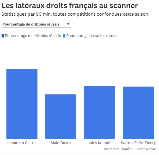 从统计数据来看,这位巴黎圣日耳曼球员受益于球队的战术风格,这使他比其他法国同胞(孔德、古斯托、克劳斯……)在带球推进层面更具进攻性。但这掩盖了他的一些防守弱点。“我认为他无法胜任法国国家队这个位置的首发,”曼努埃尔-阿莫罗斯(82次出场)补充道,“我并不是说他踢得不好,而是说他在防守端存在一些问题。由于巴黎圣日耳曼占据优势,我们很少看到他的这些表现。例如,当球在左路时,他的覆盖范围不够。这是边后卫在青训营里就应该掌握的本能反应。”