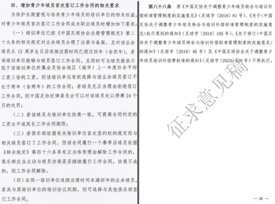 但全新的《球员身份及转会管理规定(征求意见稿)》明确《关于调整青少年球员转会与培训补偿标准管理制度的实施意见》(2018)及后续的执行原则、修订版本不再执行。