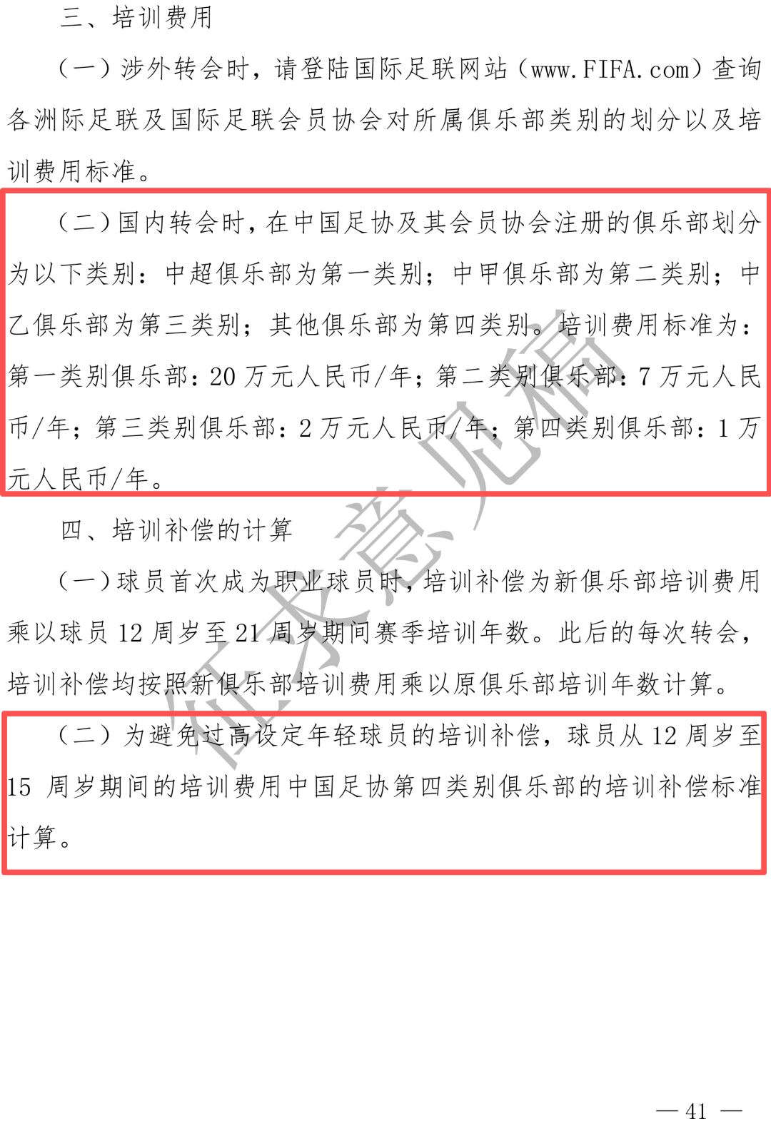 ▲全新的《球员身份及转会管理规定(征求意见稿)》沿用了2023年修改后的培训补偿标准