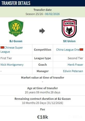 德转显示,王宇翔从北京国安加盟陕西联合的转会费约15万人民币。