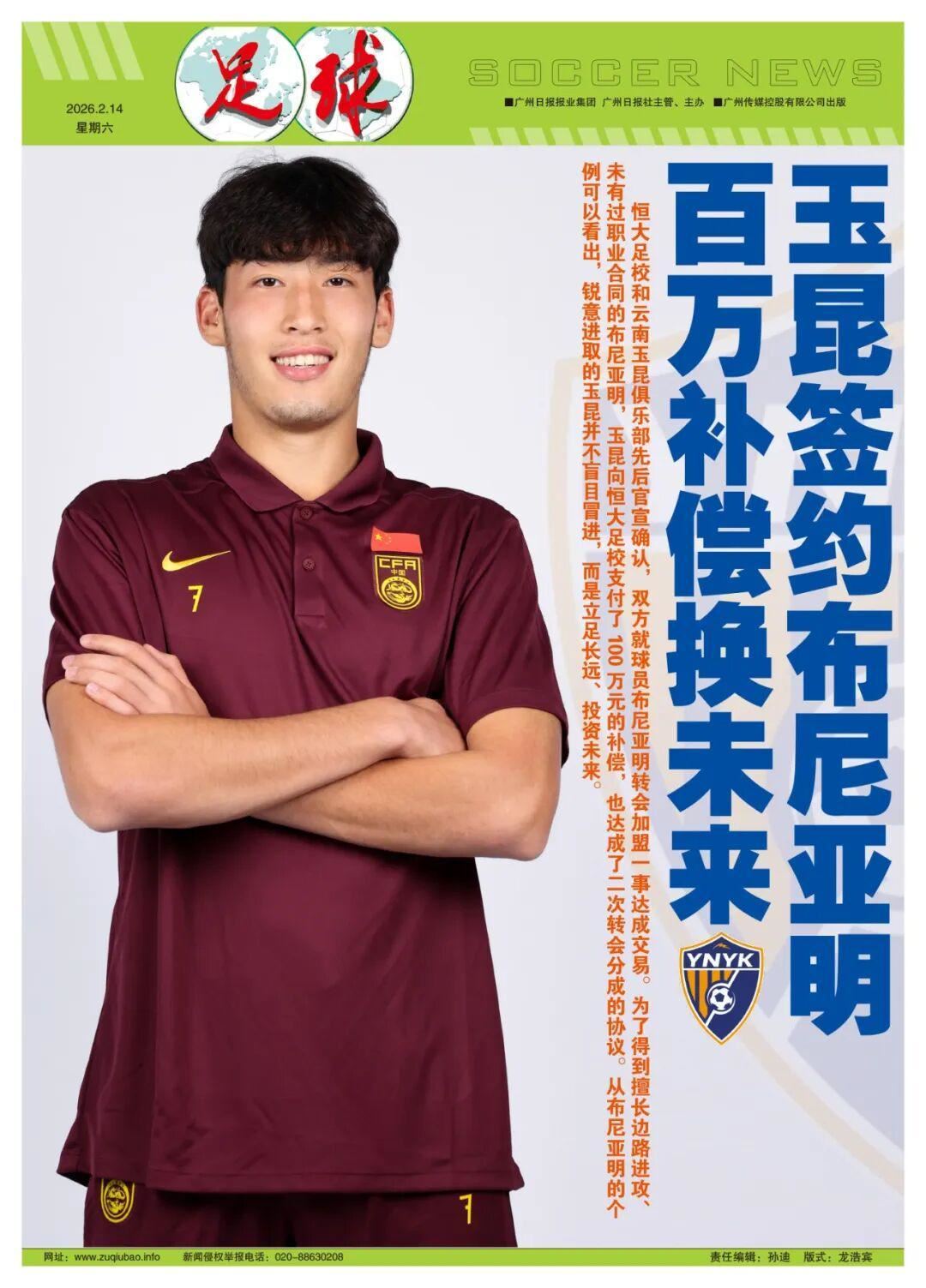 撰稿/左瑞13日下午,恒大足校和云南玉昆俱乐部先后官宣确认,双方就球员布尼亚明转会加盟一事达成交易。至此,玉昆完成了蛇年最后一笔引援,获得了这名17岁的希望之星。