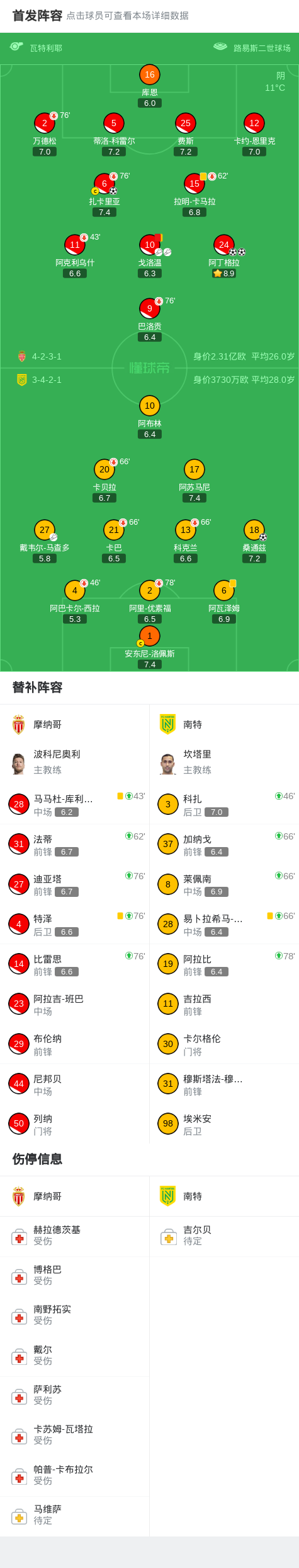 北京时间2月14日法国足球甲级联赛第22轮,摩纳哥主场对阵南特。比赛中,摩纳哥球员阿丁格拉先后两次打入进球,扎卡里亚也成功破门;南特球员桑通兹在对方球员的助攻下打入一球。此外,摩纳哥一名球员在比赛中累计吃到两张黄牌。最终,摩纳哥以3比1的比分战胜南特。