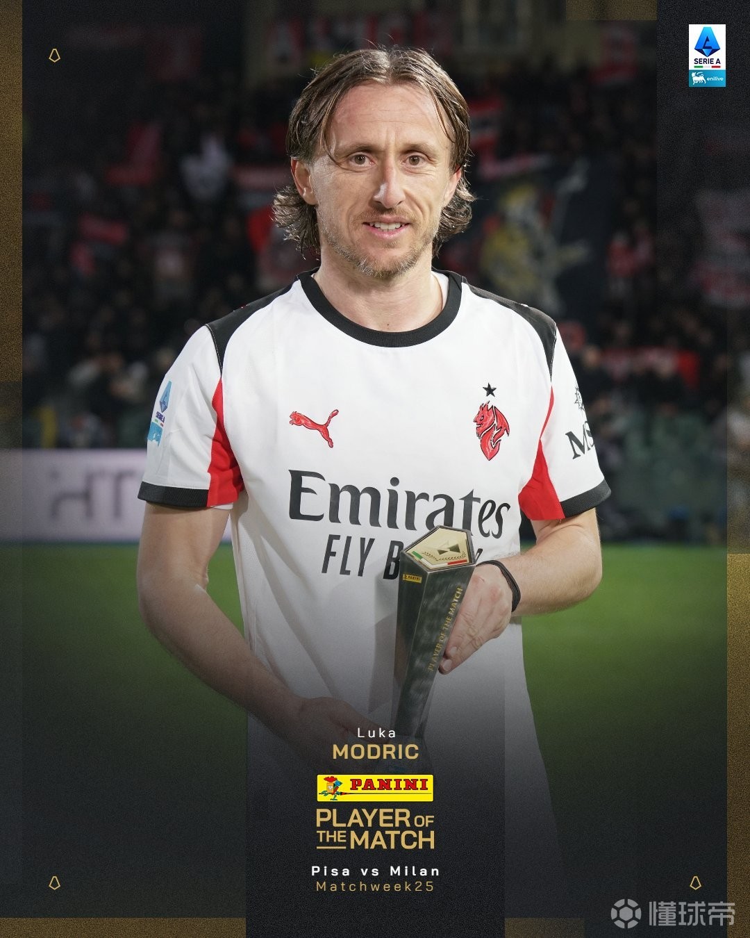 官方消息,莫德里奇当选比萨对阵米兰一役全场最佳。