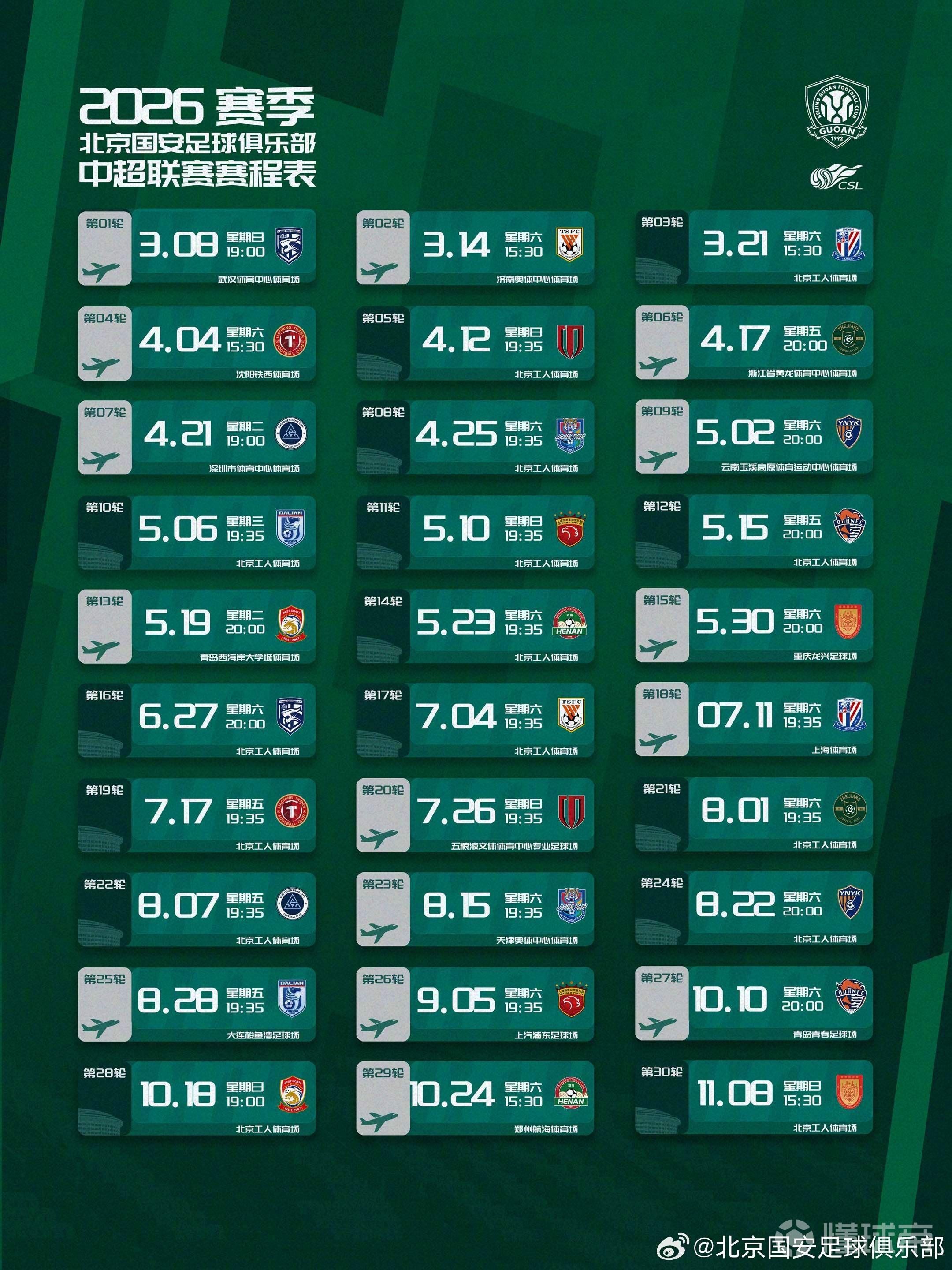 2026赛季中超联赛赛程公布,北京国安队将在第2轮客战山东泰山,第3轮迎战上海申花,第5轮迎战成都蓉城。