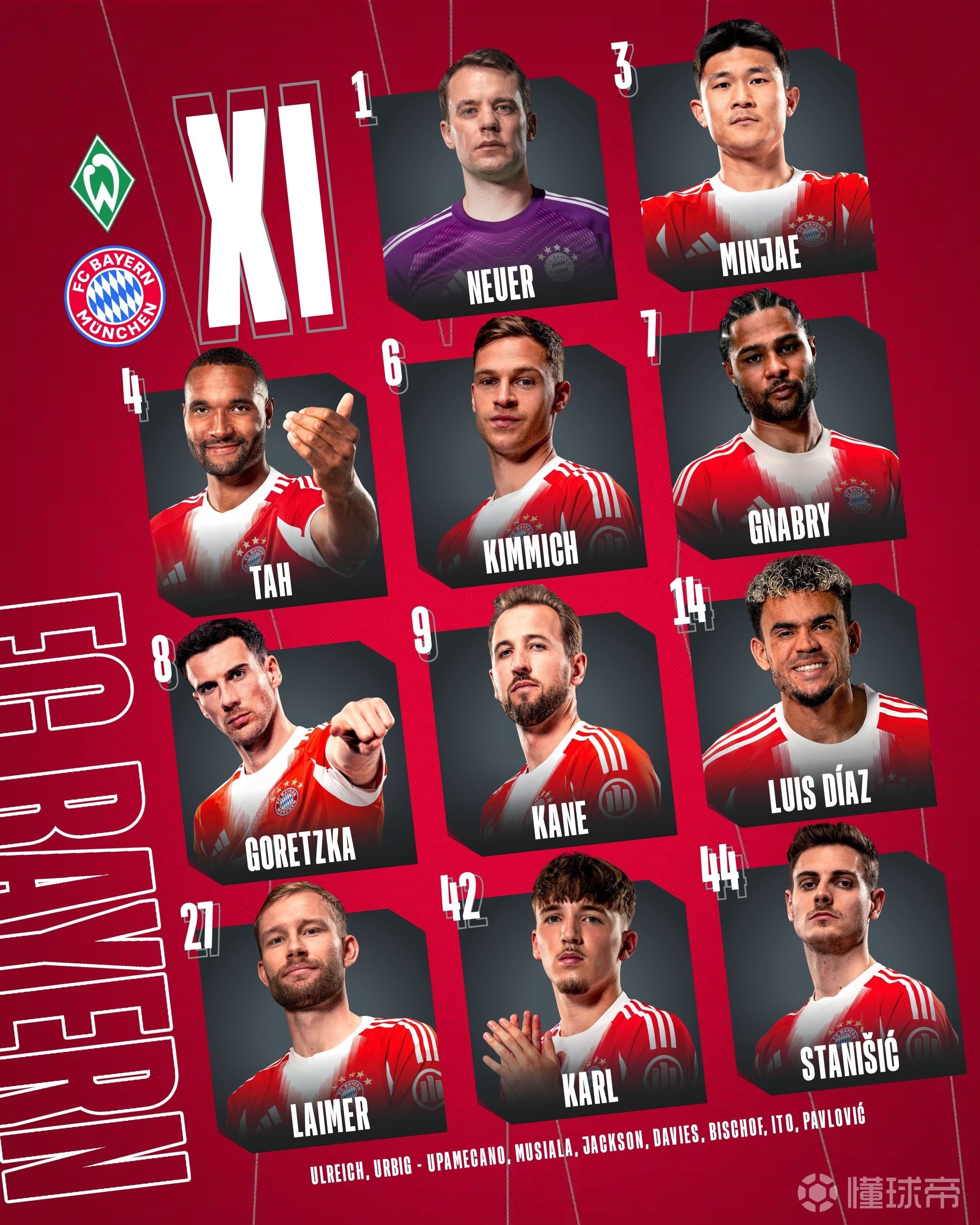 拜仁首发:1-诺伊尔、44-斯塔尼希奇、3-金玟哉、4-约纳坦-塔、27-莱默尔、6-基米希、8-格雷茨卡、42-卡尔、7-格纳布里、14-迪亚斯、9-凯恩