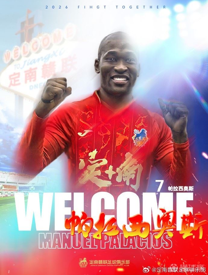 2月15日,定南赣联足球俱乐部官方宣布,外援帕拉西奥斯加盟球队。