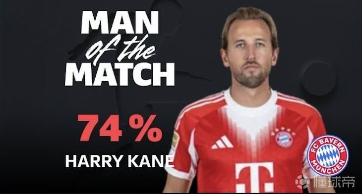最终经过德甲官网球迷投票,凯恩以74%的得票率当选全场最佳球员。