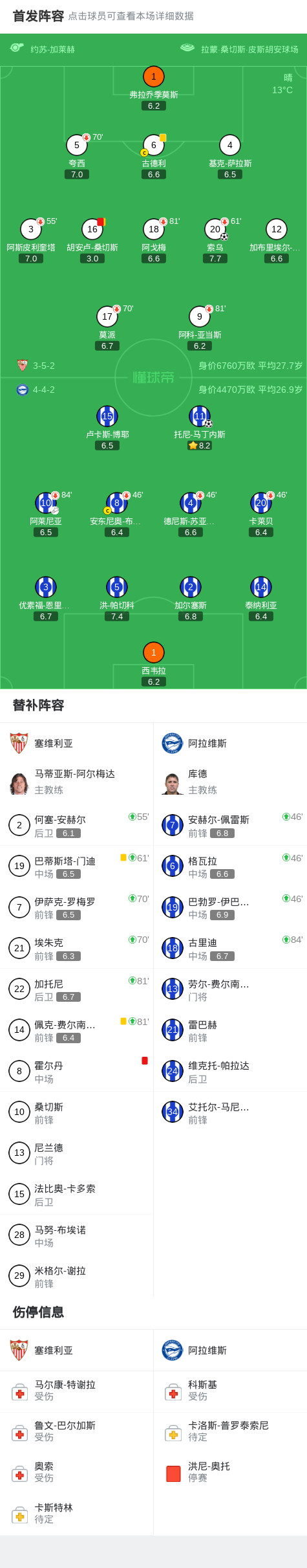 北京时间2月15日西班牙足球甲级联赛 联赛 第24轮,塞维利亚主场对阵阿拉维斯。塞维利亚索乌破门。阿拉维斯托尼-马丁内斯破门。最终比分塞维利亚 1-1 阿拉维斯。