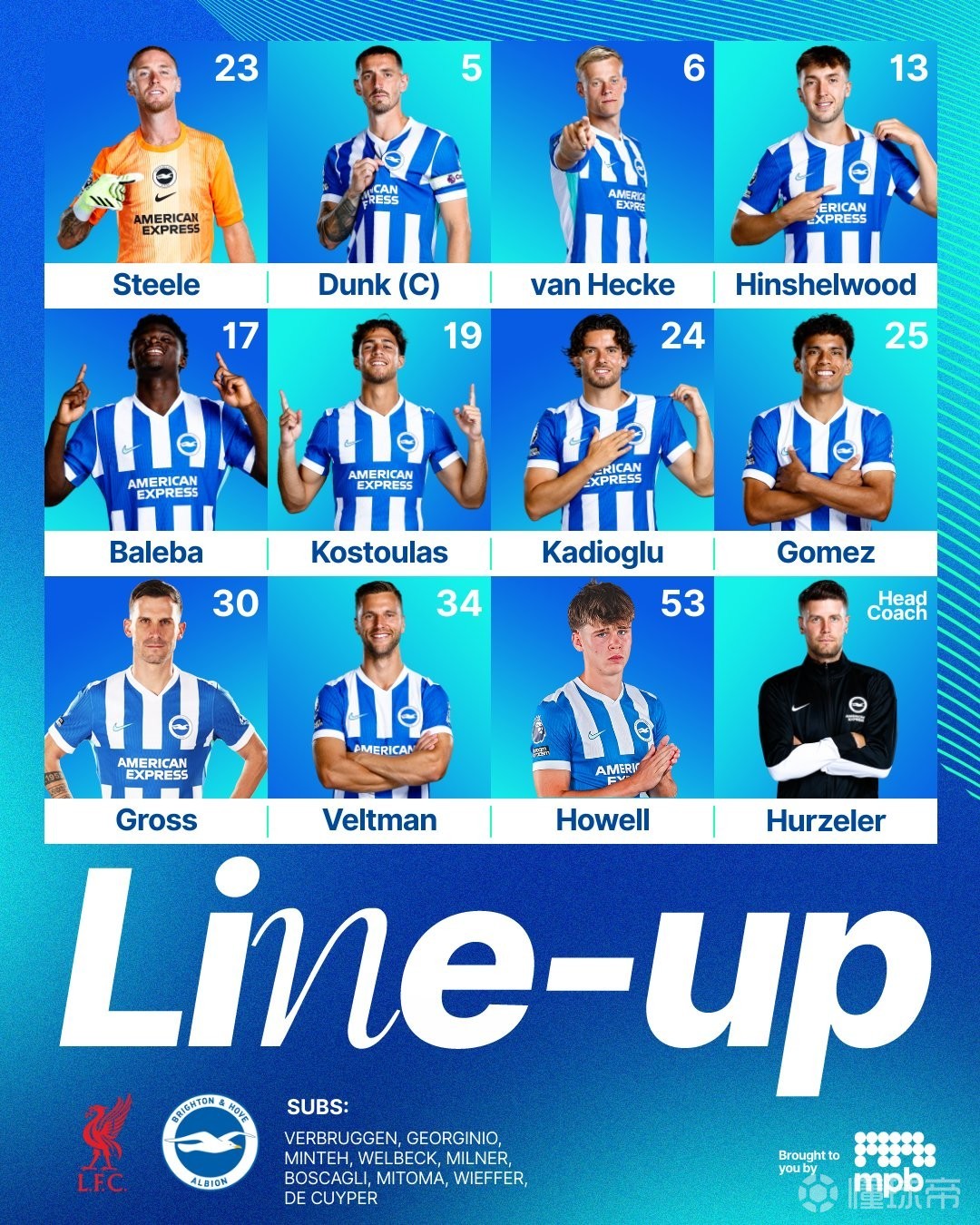 布莱顿首发:23-贾森-斯蒂尔、24-卡迪奥卢、5-邓克、6-范黑克、34-费尔特曼、53-哈里-豪厄尔、13-杰克-欣谢尔伍德、30-格罗斯、25-迭戈-戈麦斯、17-巴莱巴、19-科斯图拉斯