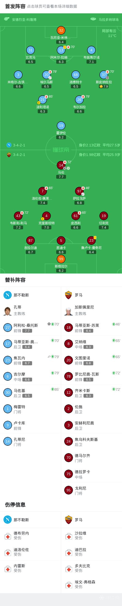 北京时间2月16日意大利足球甲级联赛第25轮,那不勒斯主场对阵罗马。上半场,萨拉戈萨助攻,马伦破门。随后,斯皮纳佐拉远射破旧主。下半场,韦斯利造点,马伦主罚命中。焦瓦内助攻,阿利松-桑托斯扳平比分。全场比赛结束,那不勒斯2-2罗马。