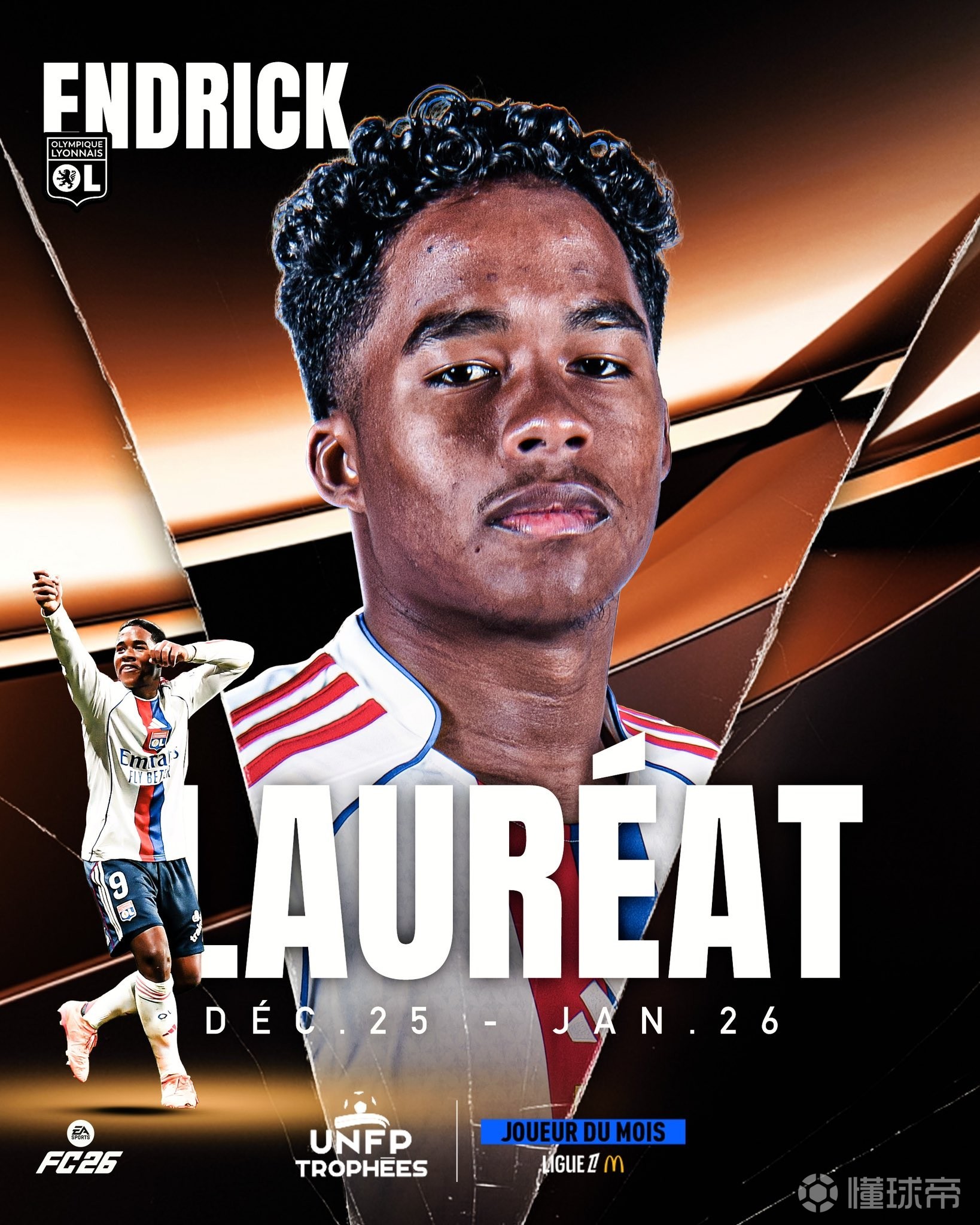北京时间2月15日,官方消息,里昂前锋恩德里克当选法甲1月最佳球员。