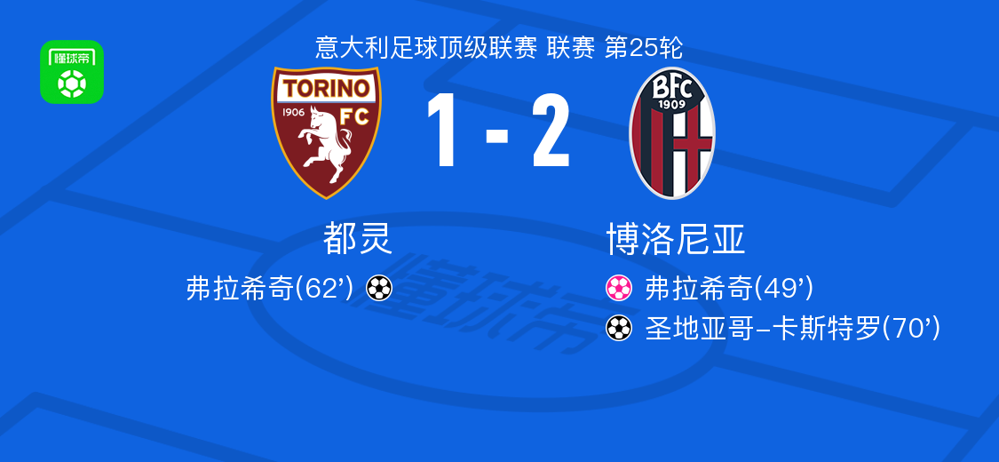 北京时间2月16日意大利足球甲级联赛第25轮,都灵主场迎战博洛尼亚。比赛中,都灵球员弗拉希奇率先出现失误,随后他为球队攻入一球;博洛尼亚球员通过配合由圣地亚哥-卡斯特罗完成破门。最终,都灵1-2不敌博洛尼亚。