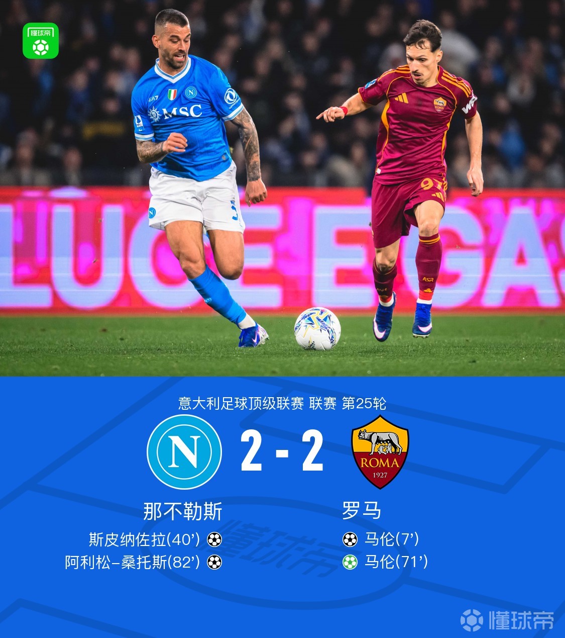 北京时间2月16日意大利足球甲级联赛第25轮,那不勒斯主场对阵罗马。上半场,萨拉戈萨助攻,马伦破门。随后,斯皮纳佐拉远射破旧主。下半场,韦斯利造点,马伦主罚命中。焦瓦内助攻,阿利松-桑托斯扳平比分。全场比赛结束,那不勒斯2-2罗马。