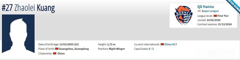 北京时间2月16日,德转更新,16岁前锋邝兆镭自由身加盟青岛海牛,双方签约3年。
