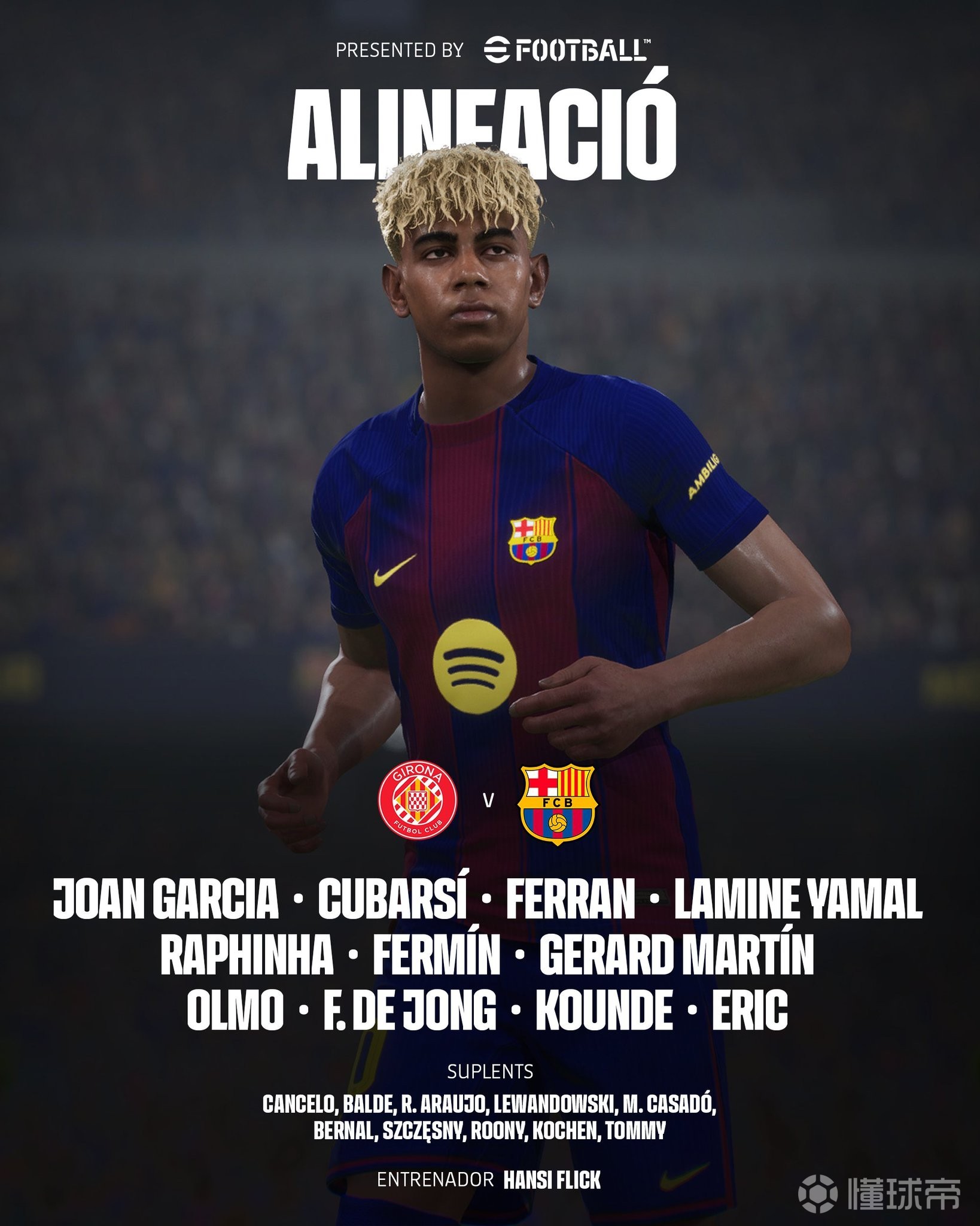 替补:25-什琴斯尼、31-迭戈-科亨、2-坎塞洛、3-阿莱士-巴尔德、4-阿劳霍、9-莱万多夫斯基、17-卡萨多、22-马克-贝尔纳尔、19-巴尔德吉、43-汤米-马克斯