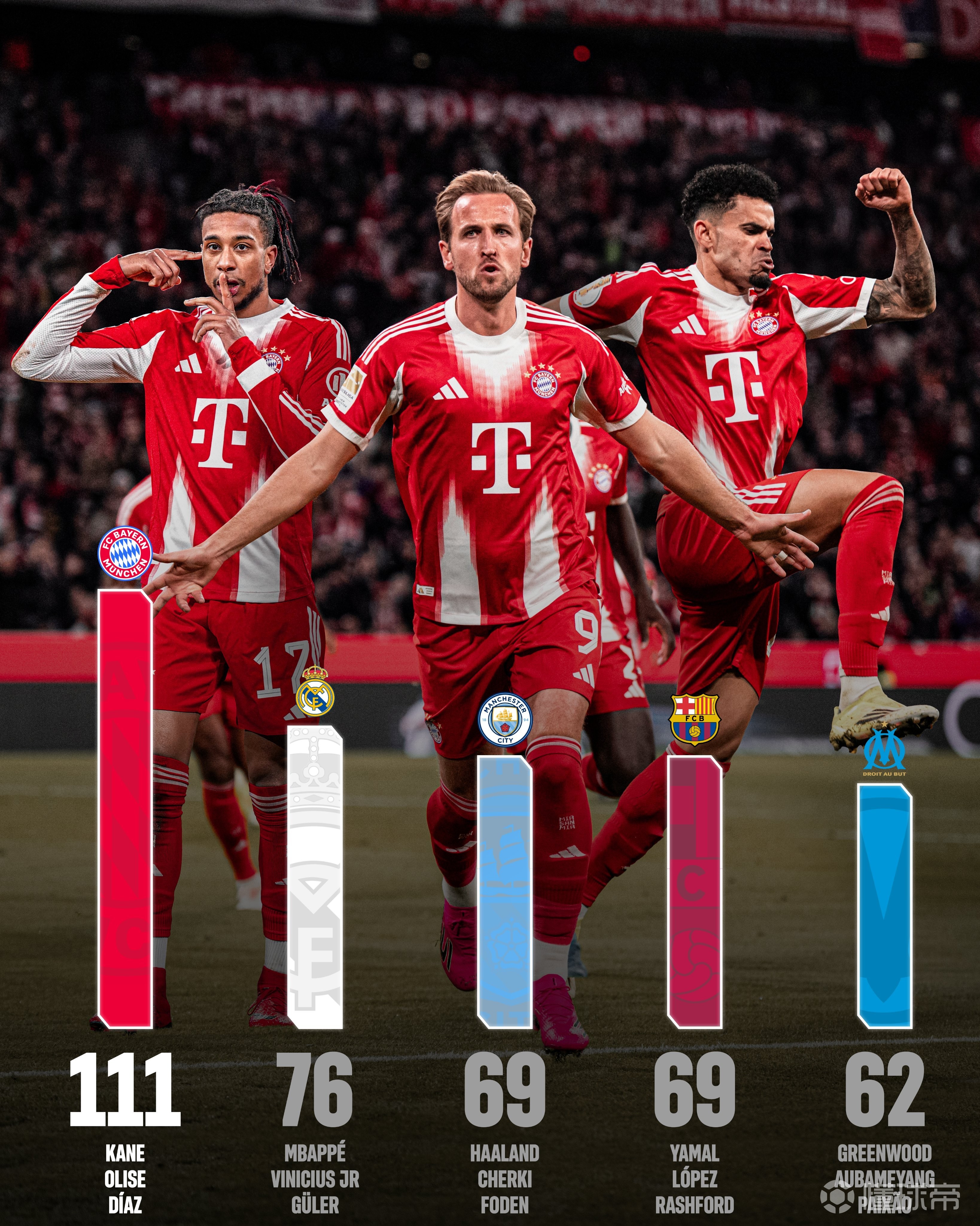 此外,皇马的姆巴佩、维尼修斯、居莱尔共参与76球,曼城的哈兰德、谢尔基、福登参与69球,巴萨的亚马尔、拉什福德、费尔明参与69球,马赛的格林伍德、奥巴梅扬、派尚参与62球。