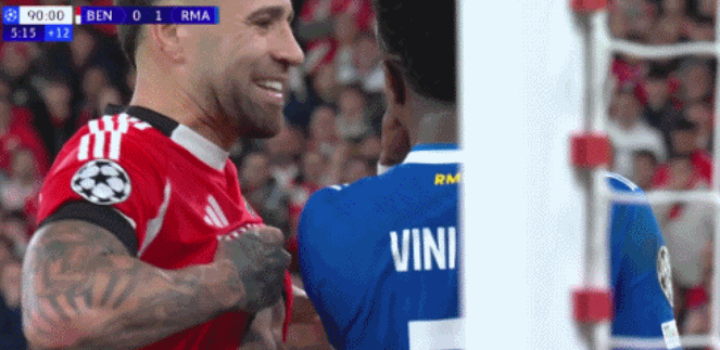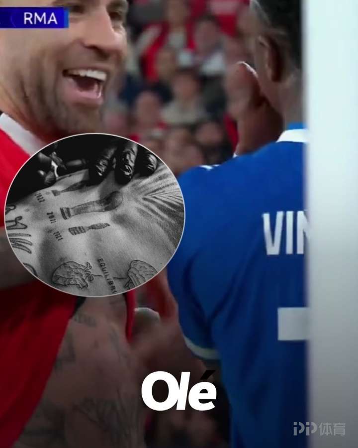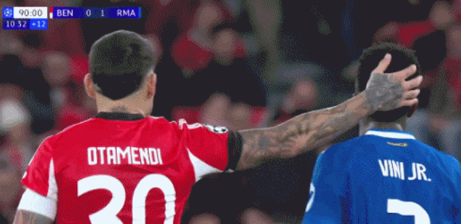 欧冠1/8决赛附加赛首回合,皇家马德里客战本菲卡,比赛补时,奥塔门迪向维尼修斯展示了自己的世界杯冠军纹身,两个人都笑了。