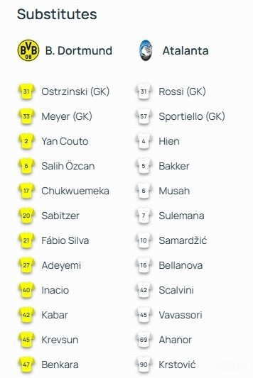 替补:31-弗朗切斯科-罗西、57-斯波尔蒂耶洛、4-希恩、5-巴克、6-尤纳斯-穆萨、7-苏莱曼纳、10-萨马尔季奇、16-贝拉诺瓦、42-斯卡尔维尼、45-瓦瓦索里、69-阿哈诺尔、90克尔斯托维奇