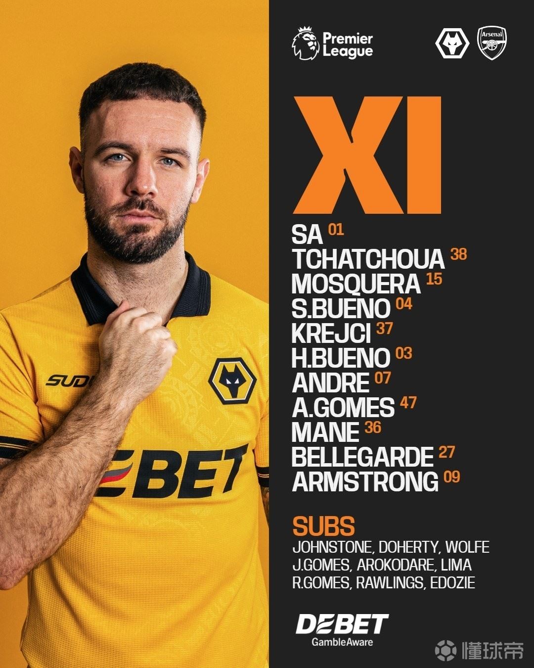 狼队首发:1-若泽-萨、15-耶尔森-莫斯克拉、4-布埃诺、37-克雷伊奇、38-查舒亚、47-安热尔-戈梅斯、7-安德烈、3-乌戈-布埃诺、36-马特乌斯-马内、27-贝勒加德、9-亚当-阿姆斯特朗