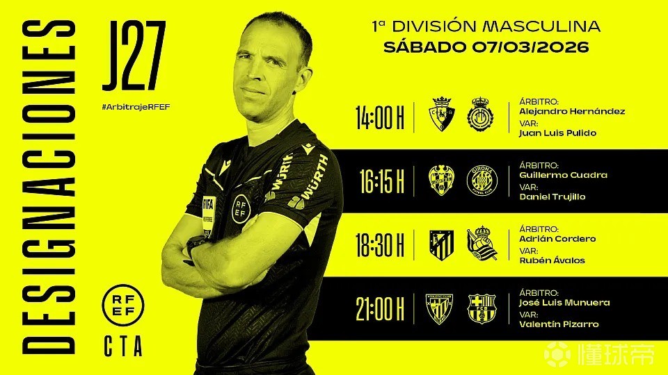 周六西甲裁判安排:何塞-穆努埃拉将执法巴萨客战毕包