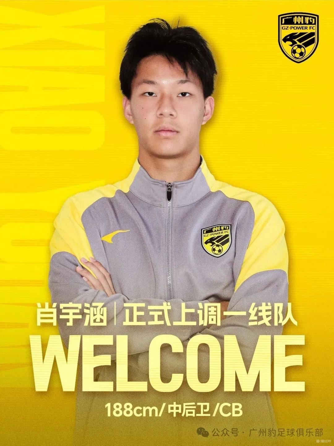 广州豹官方:原U19梯队中卫肖宇涵正式上调一线队